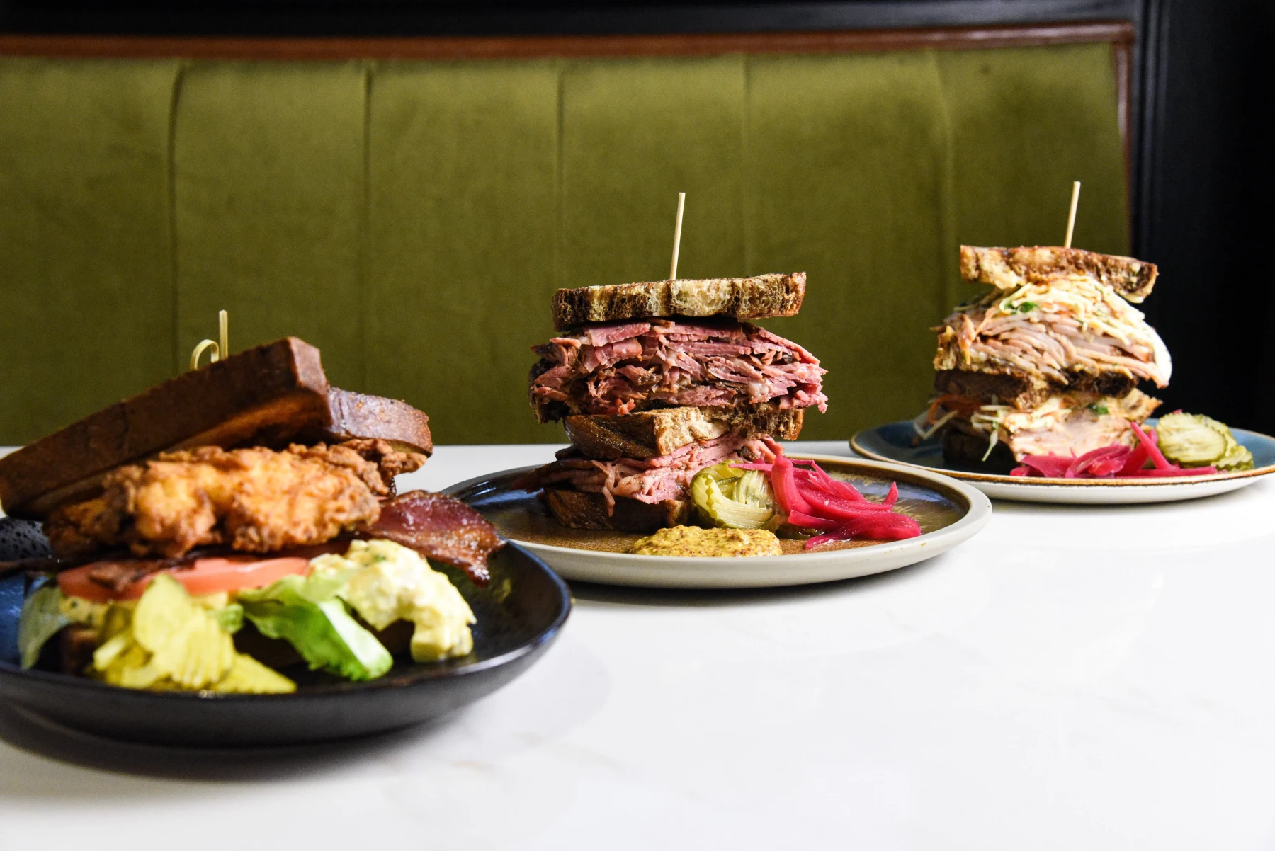 a combo of smoked turkey and Proof pastrami, served on marble rye bread